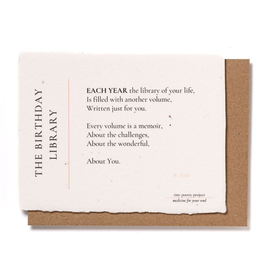 Tiny Poetry Project notecards are a gift to be meditated upon, shared, and then planted or framed. The up-cycled paper is handmade by local artisans and embedded with wildflower seeds. The envelopes are 100% recycled and the clear sleeves are plant based and compostable. Plantable inside or outside. Tiny poetry project cards are kind to our hearts and to the environment.