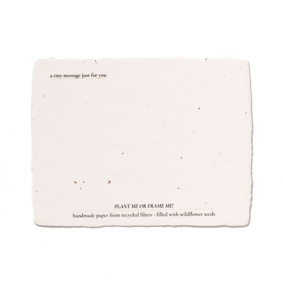 Tiny Poetry Project notecards are a gift to be meditated upon, shared, and then planted or framed. The up-cycled paper is handmade by local artisans and embedded with wildflower seeds. The envelopes are 100% recycled and the clear sleeves are plant based and compostable. Plantable inside or outside. Tiny poetry project cards are kind to our hearts and to the environment.