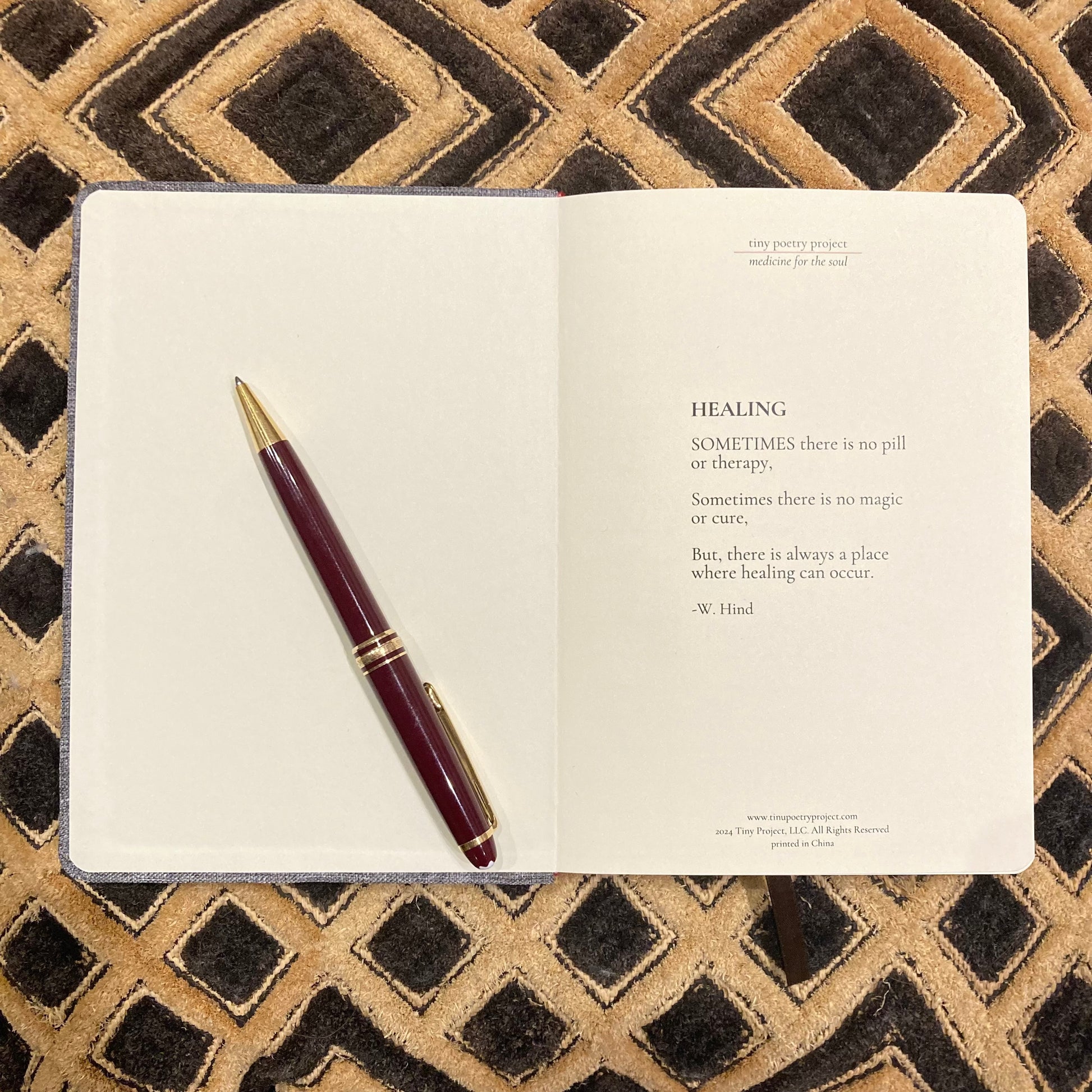 A Journal TOWARD HEALING is a beautiful linen hardcover journal in a soothing slate gray color. The first page contains the comforting tiny poetry poem, Healing, to help provide guidance for the day.