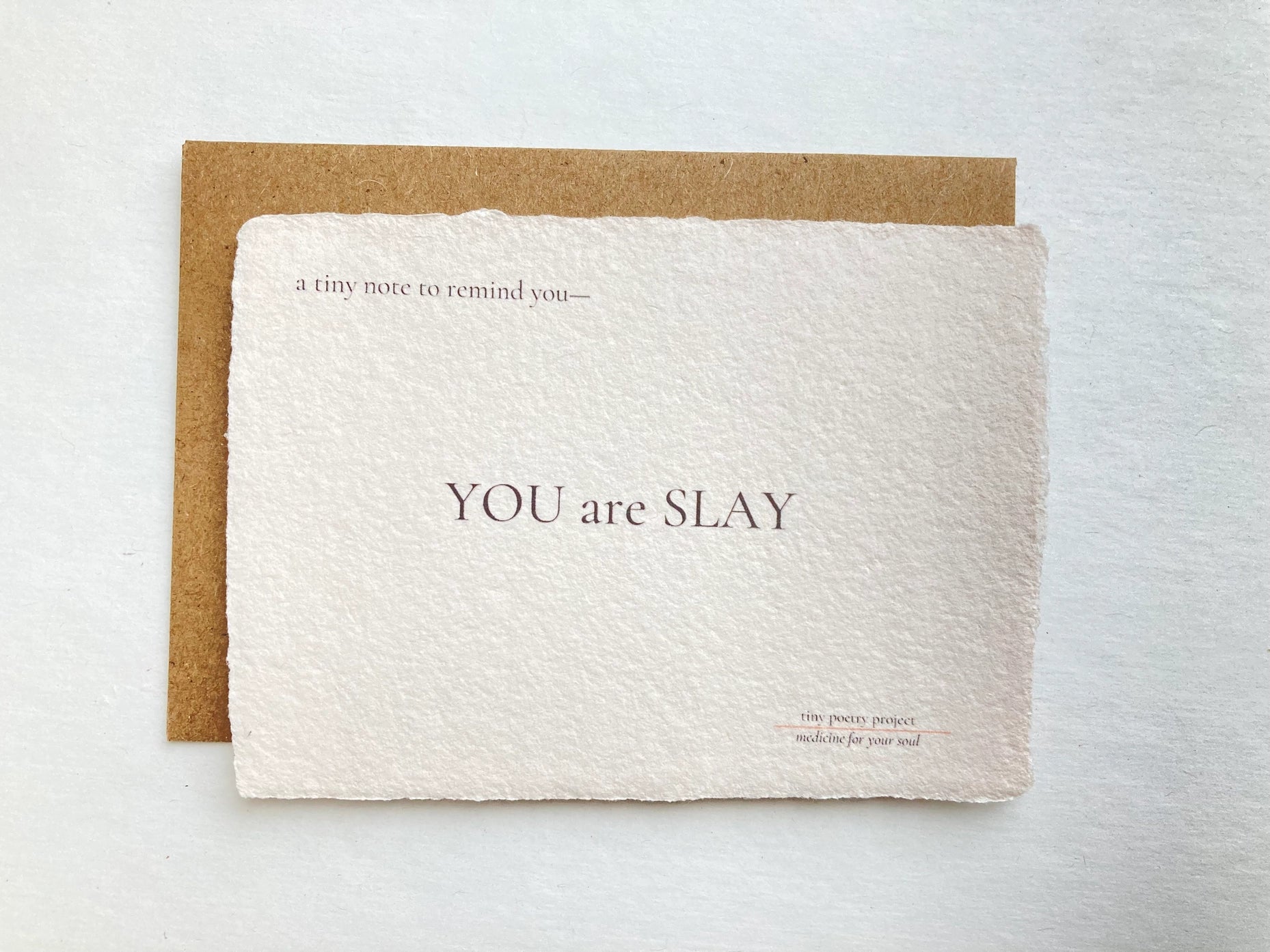 LIFT ME UP! Inspirational cards are size A1 and come printed on a beautiful pale pink, handmade, deckled edged note card. A perfect boost to send to friends and family in need of a little LIFT ME UP! Back of the card is left blank for a personal message. The card includes a 100% kraft recycled envelope and is protected with a plant based compostable clear sleeve. No Plastic! LIFT ME UP! cards are kind to our hearts and to the environment - They are medicine for the soul.